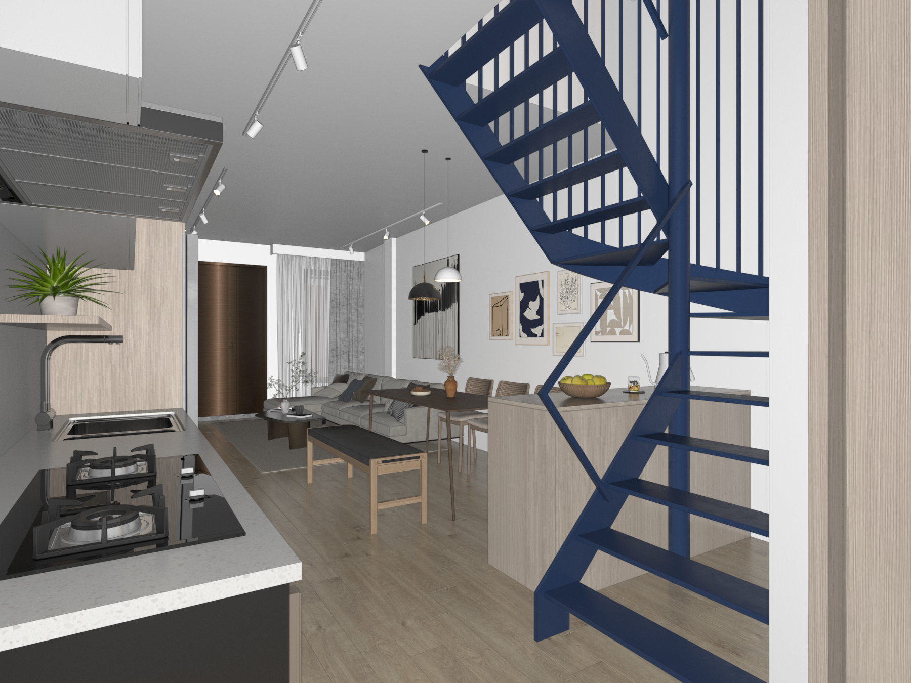 電腦生成的帶有廚房和餐廳的客廳圖像。