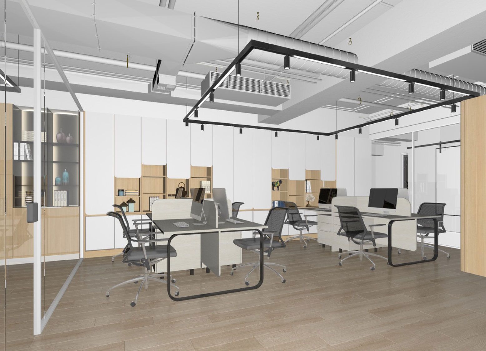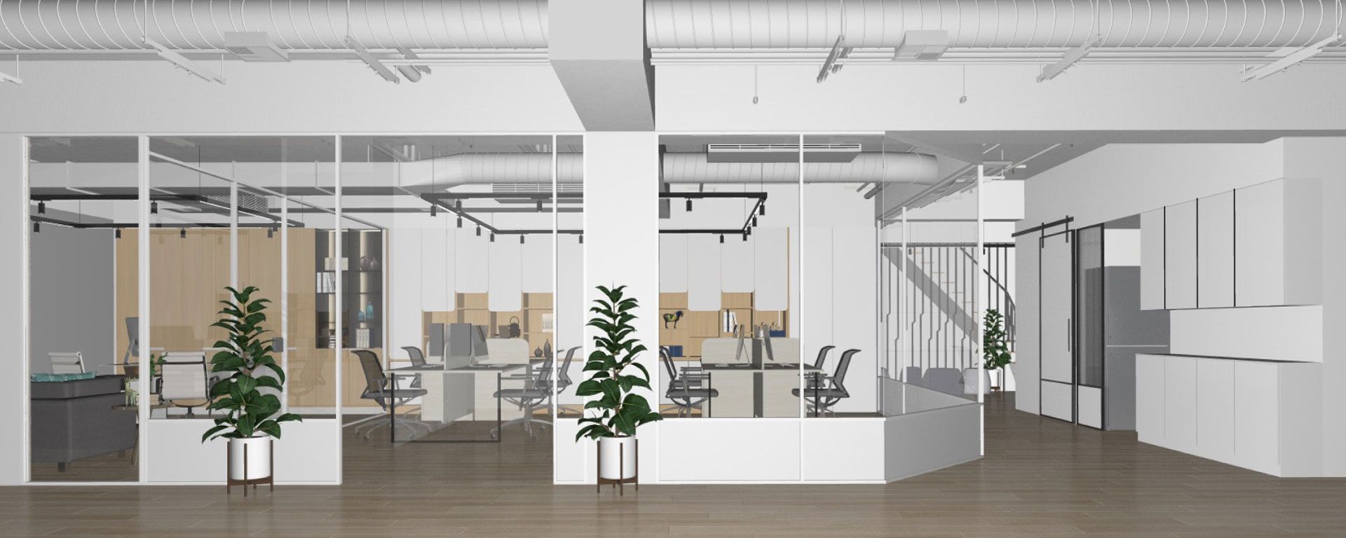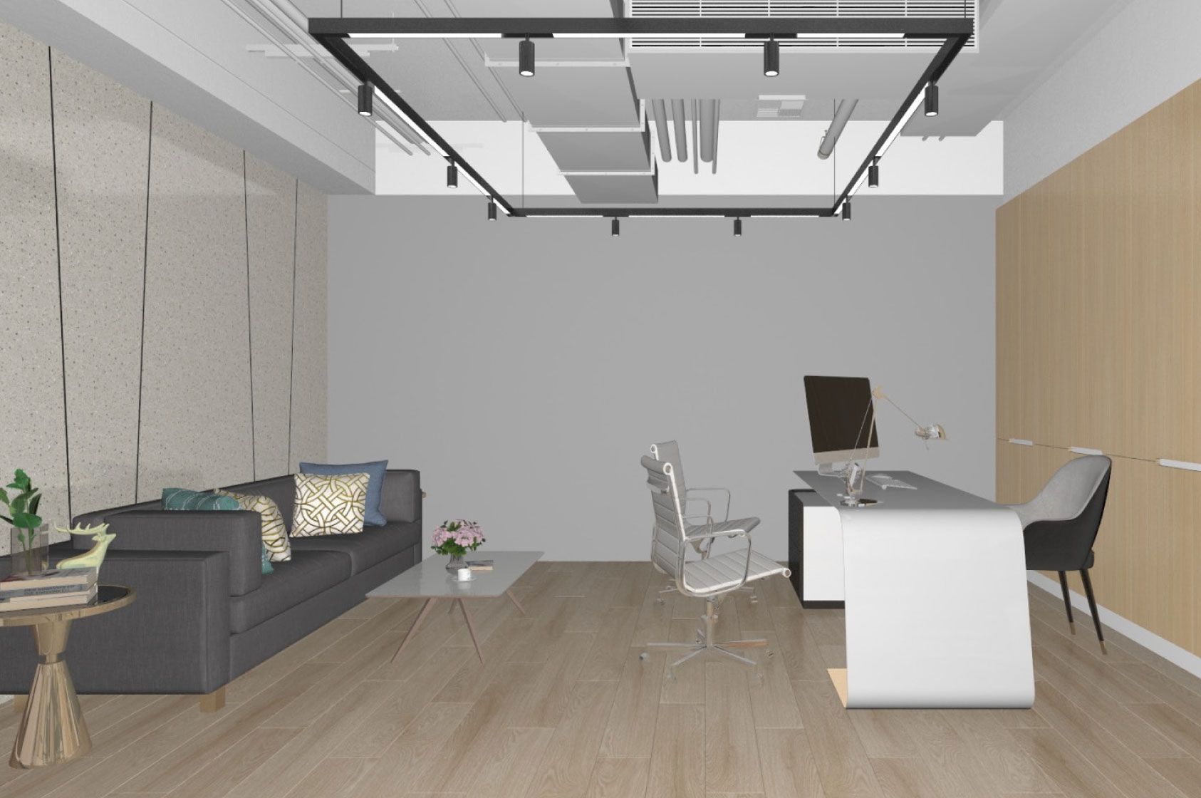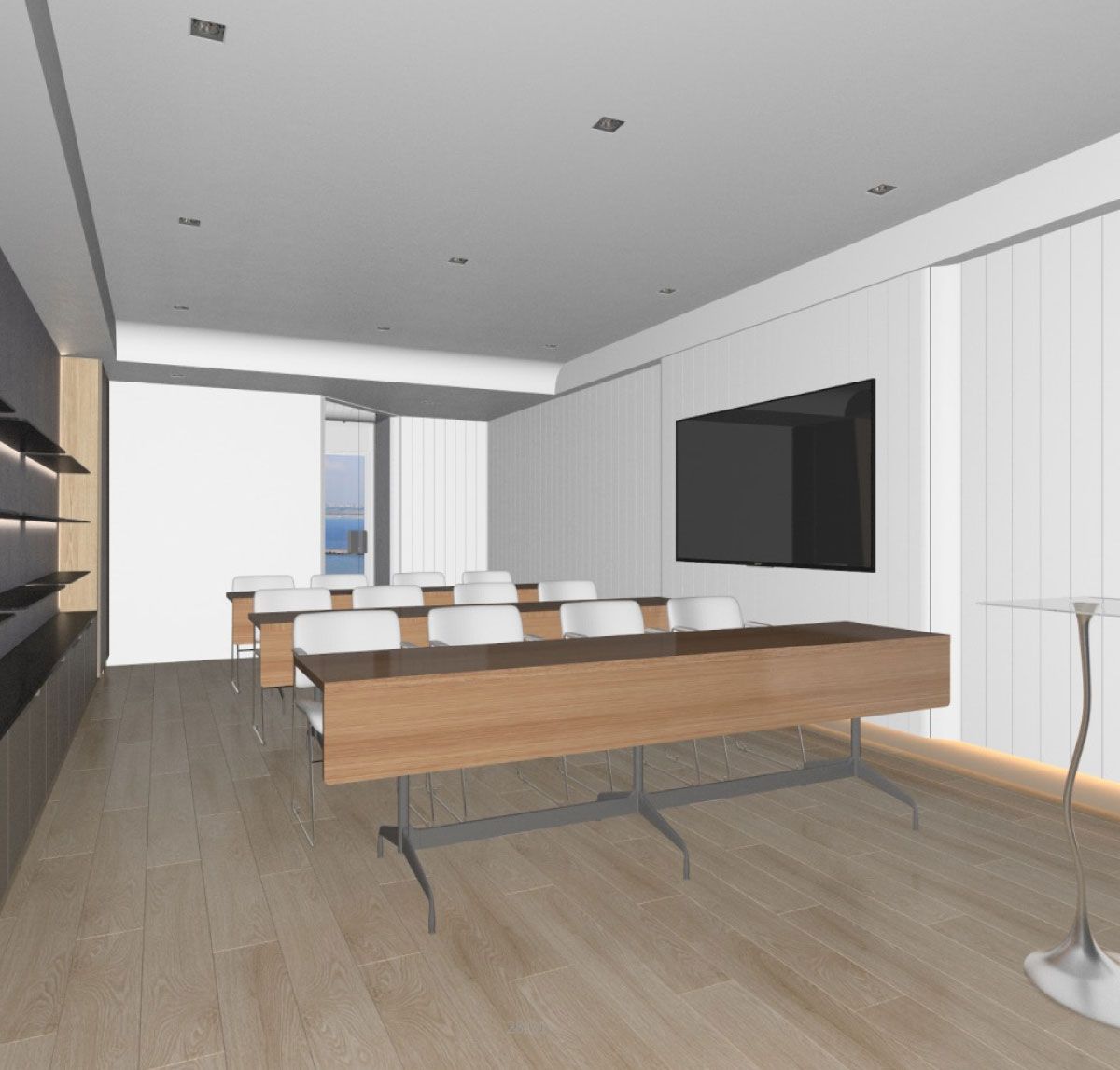 電腦生成的帶有廚房和餐廳的客廳圖像。